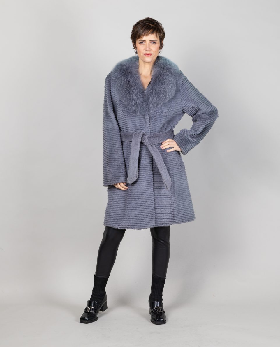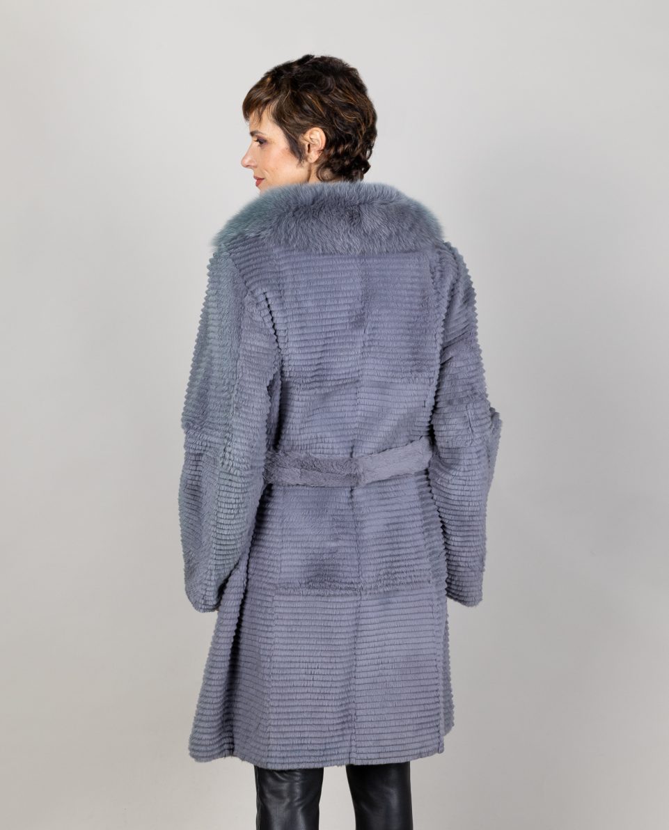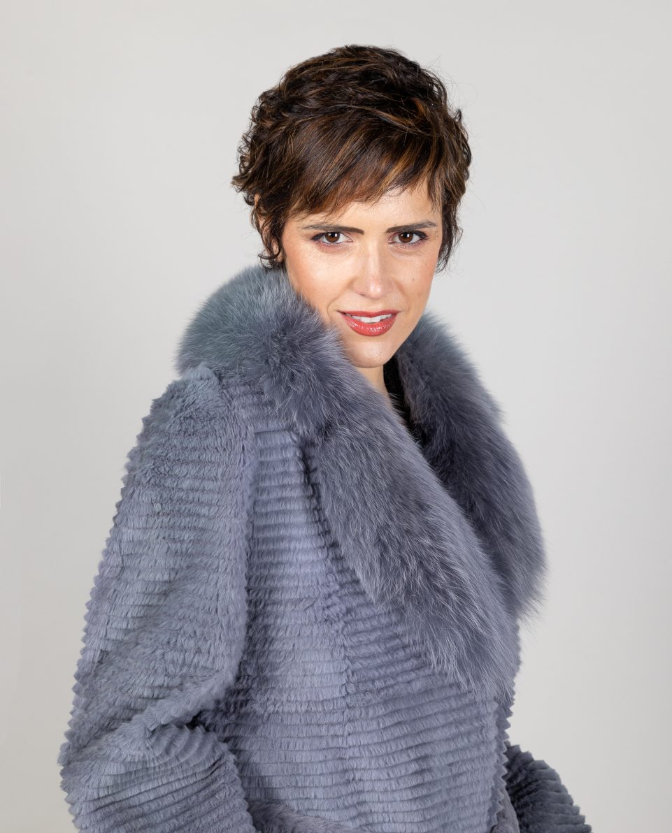 Abrigo de mujer de pelo de rex rasado en color azul con cuello smoking de pelo de zorro «blue» al tono. Trabajado en estilo Layered. Tiene cinturón y bolsillos verticales. Cierre con clip peletero; marca De la Roca.