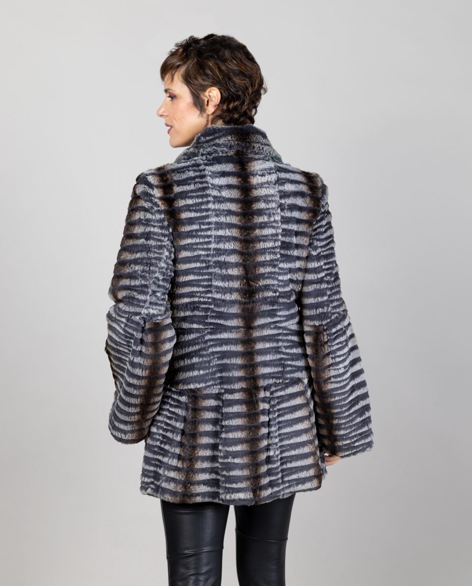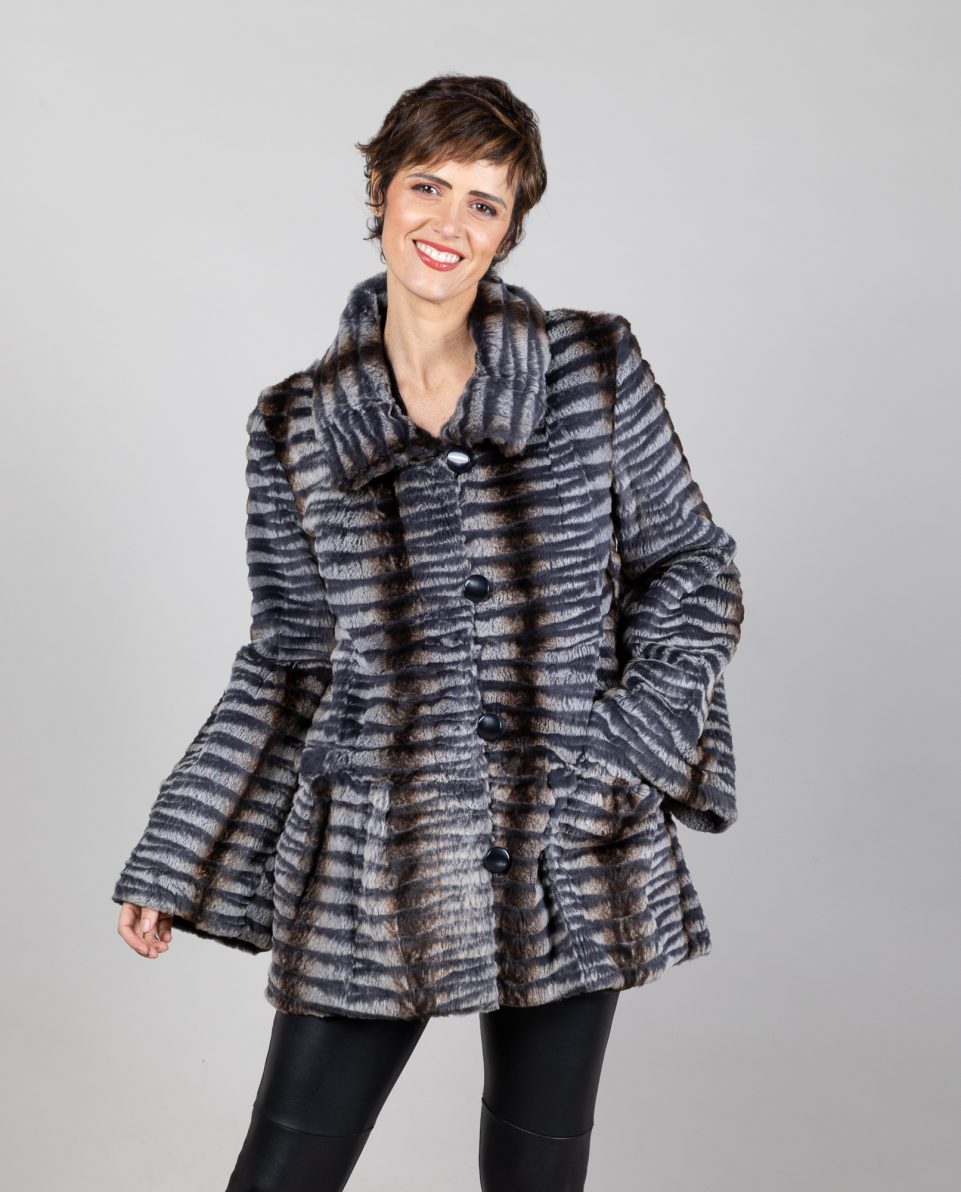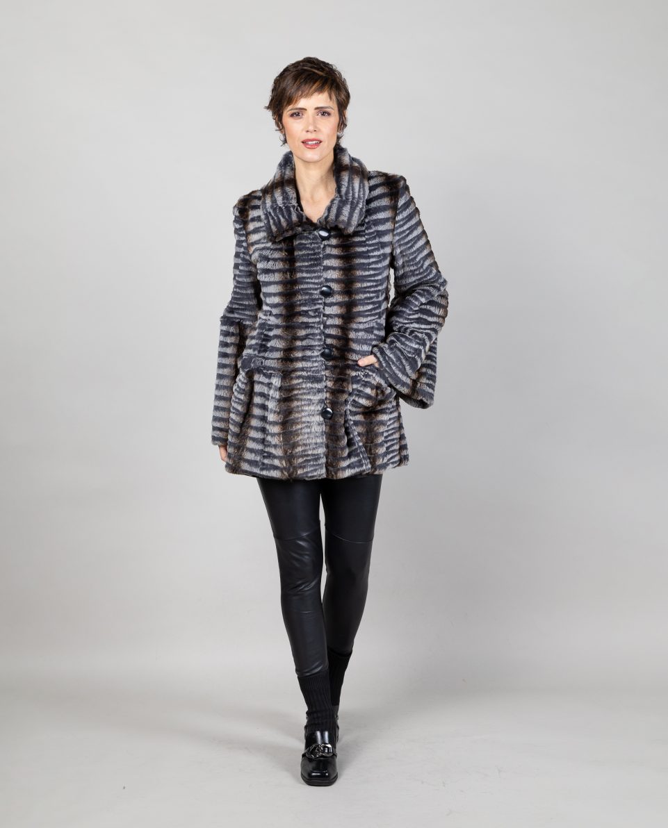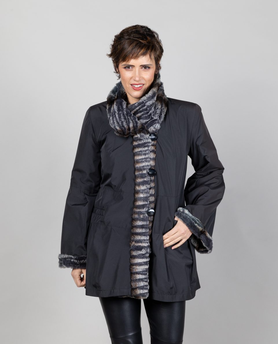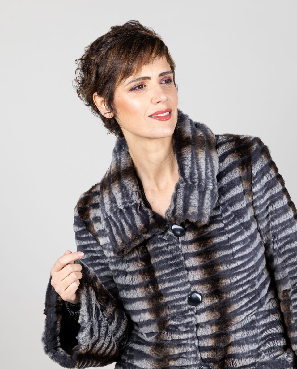 Abrigo de mujer de pelo de rex rasado gabardina bicolor chinchilla y negro. Cuello italiano, bolsillos horizontales y cierre con botones; marca De la Roca.