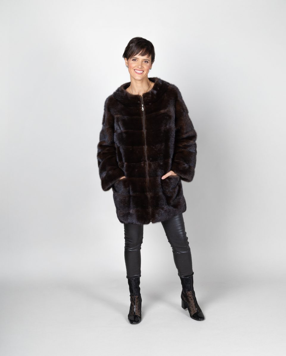 Abrigo de mujer de pelo de visón con cremallera en color marrón trabajado con pieles en horizontal. Cuello a la caja. Bolsillos horizontales; marca De la Roca.