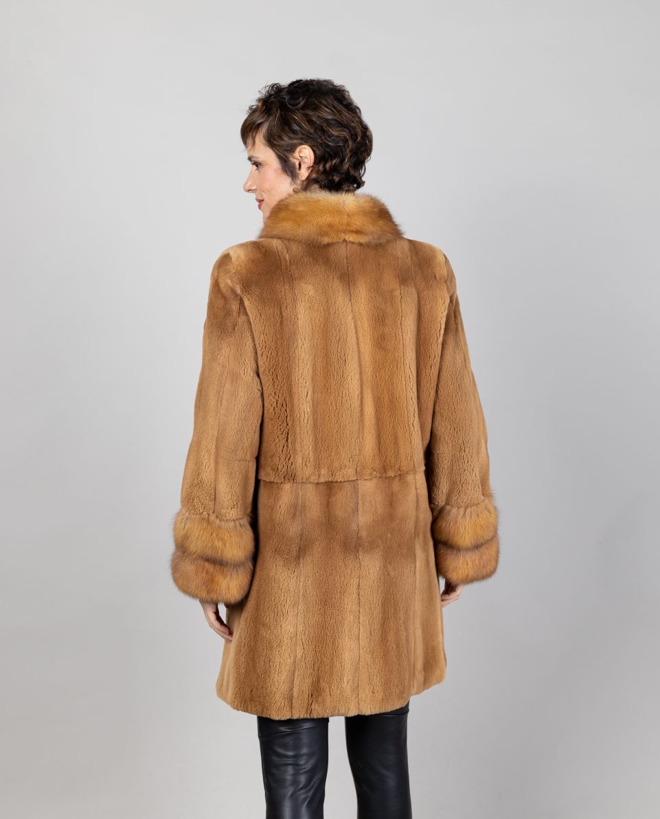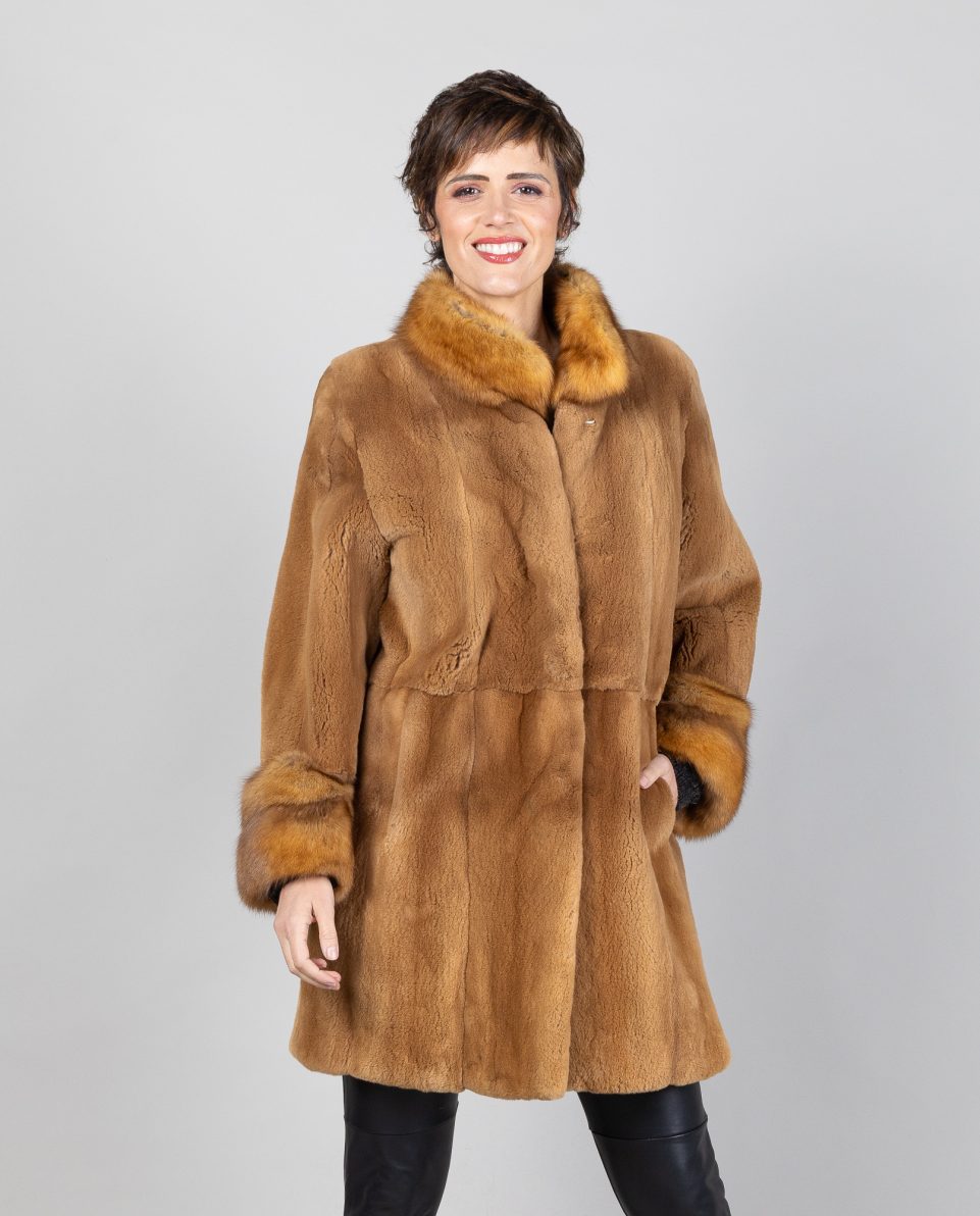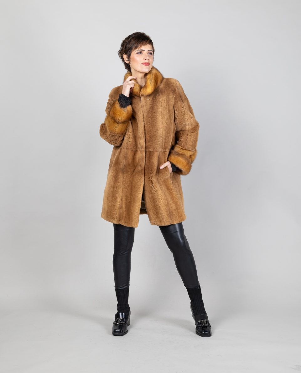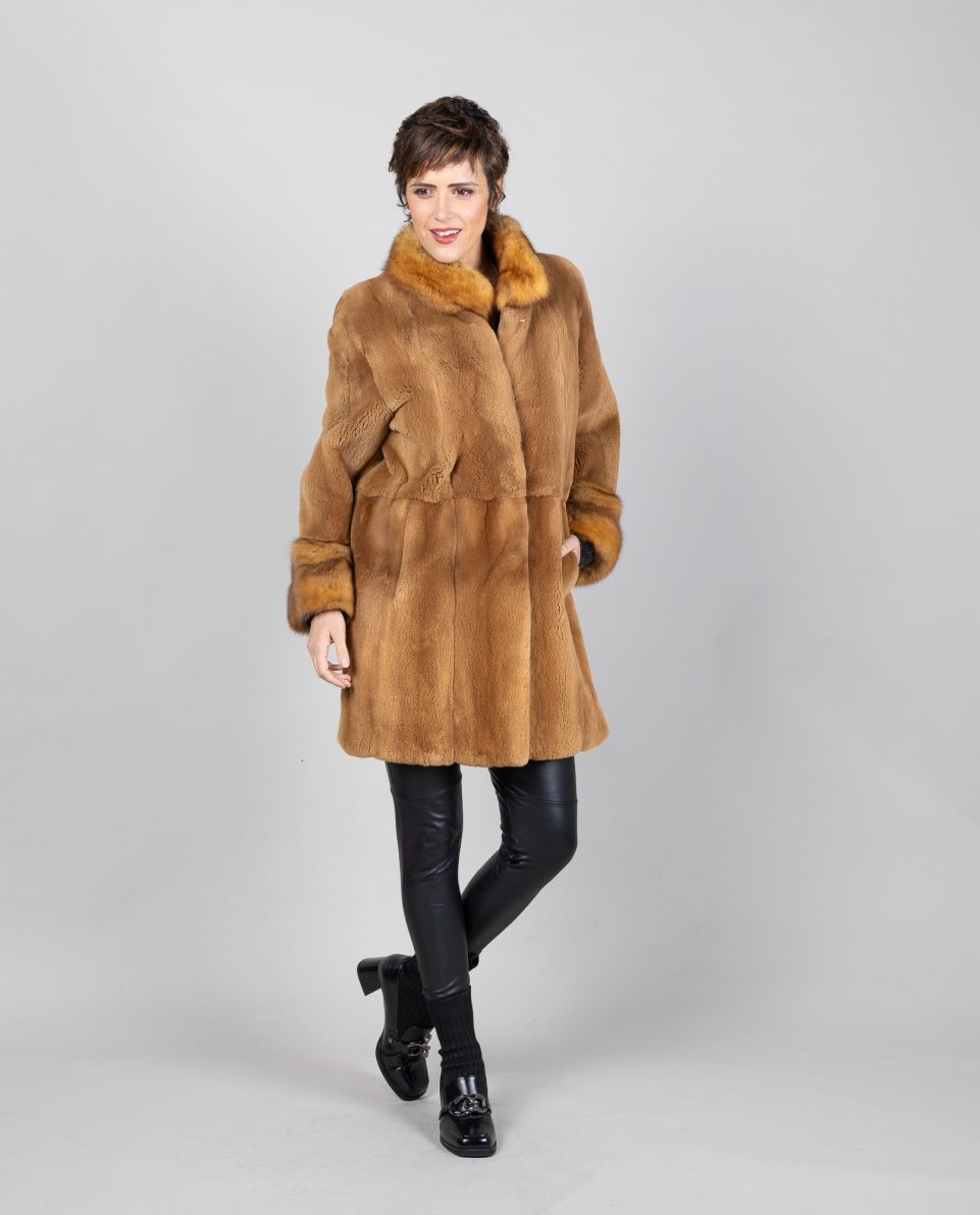 Abrigo de mujer de pelo de visón con cuello levantado en color miel y detalles de pelo de martas en el cuello y bocamangas al tono. Trabajado a piel entera. Bolsillos verticales y cierre clip peletero. ; marca De la Roca.