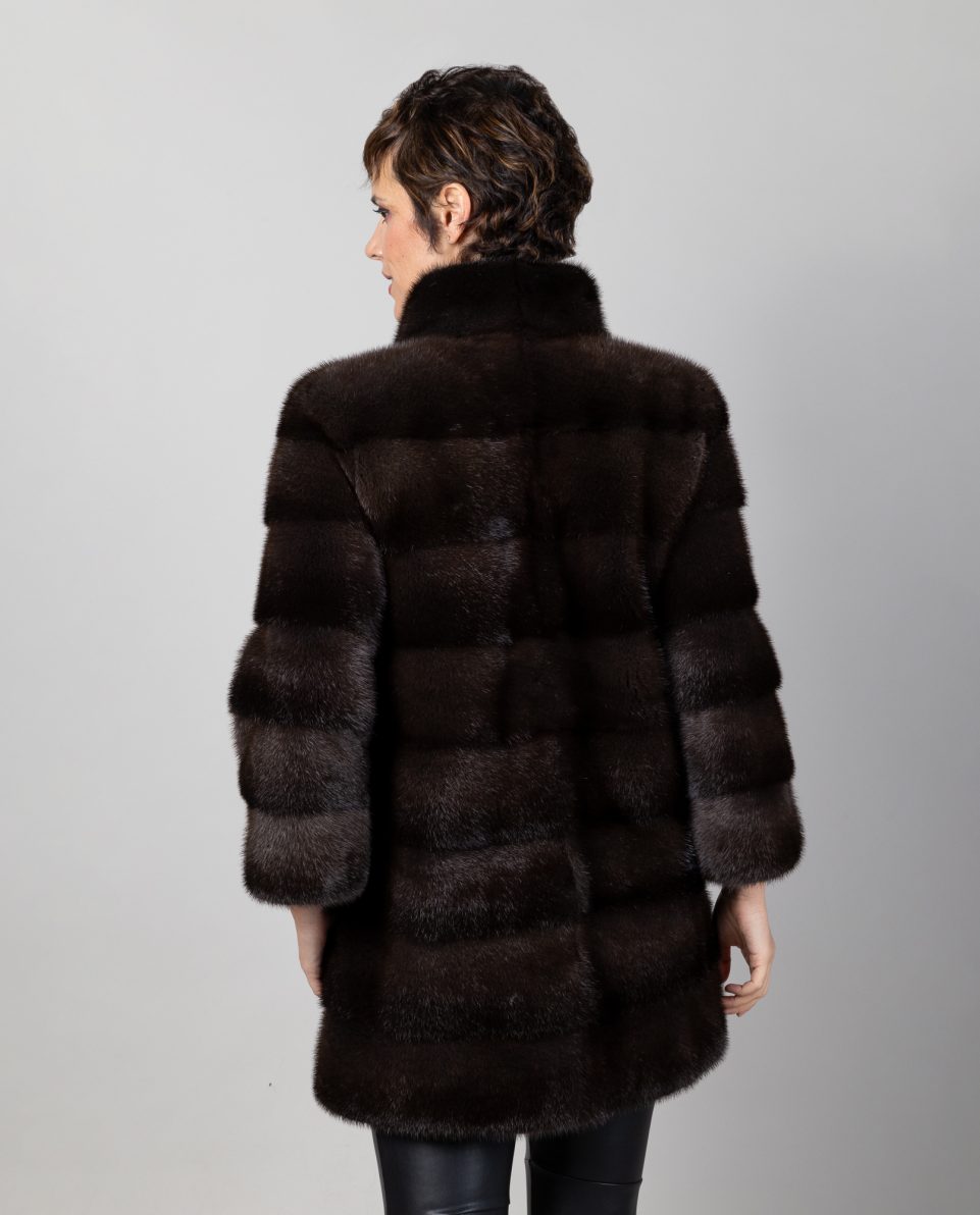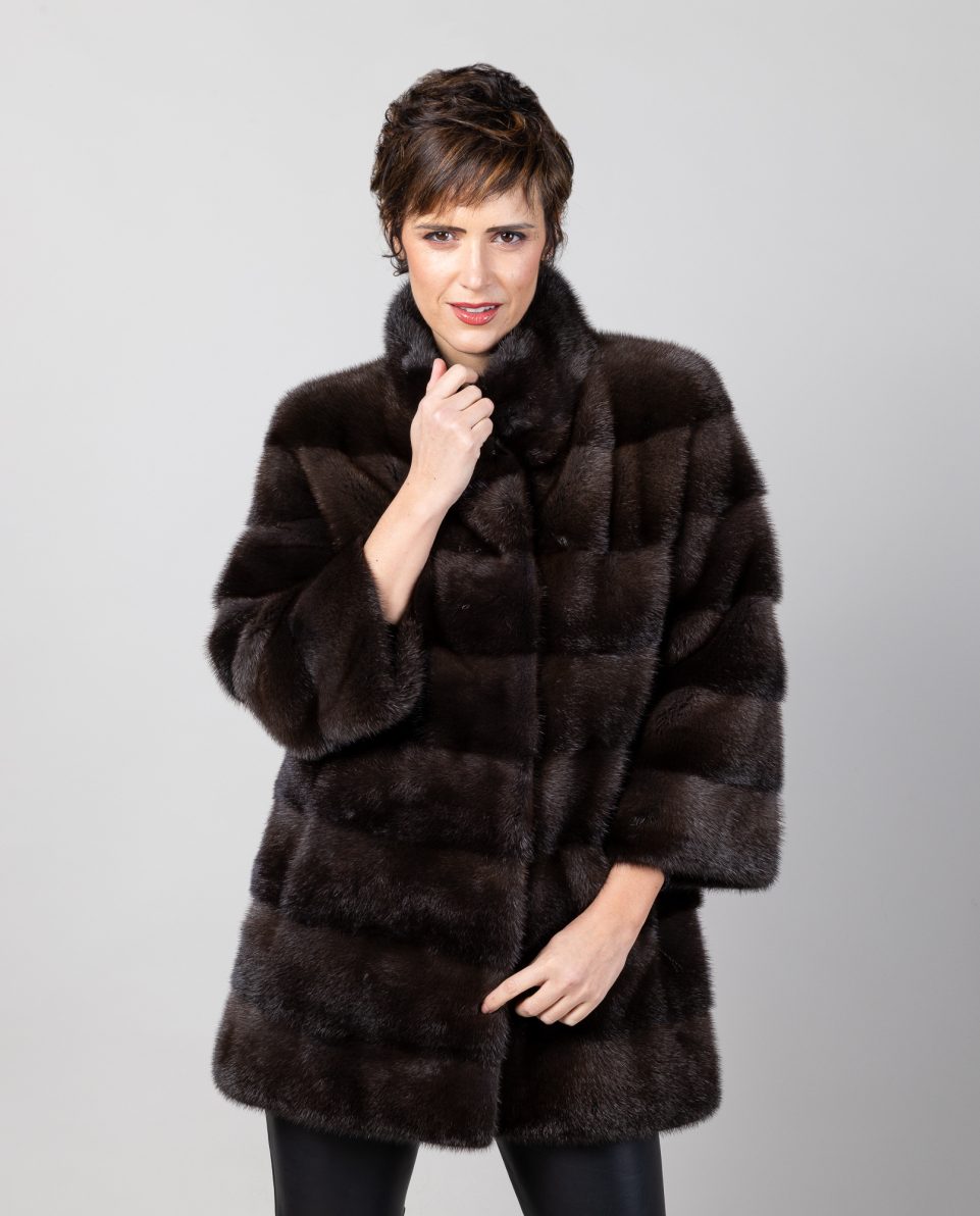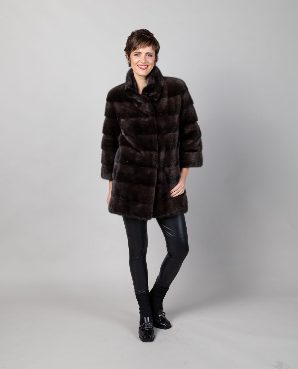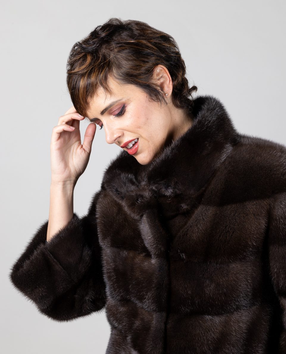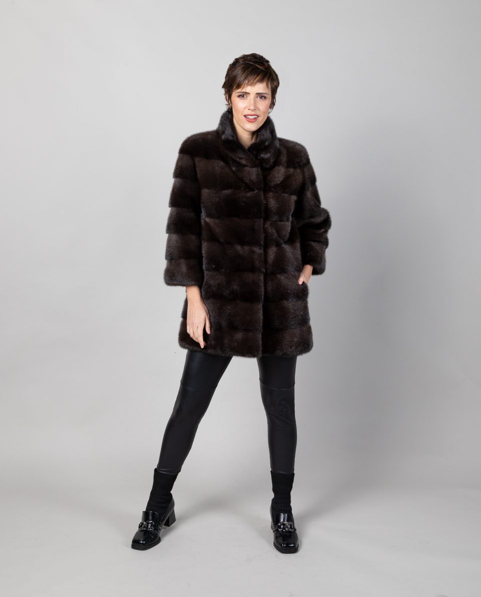 Abrigo de mujer de pelo de visón con manga francesa en color gris lutecia, trabajado en estilo horizontal con cuello levantado. Mangas francesas y bolsillos verticales. Cierre con clip peletero e imán en el cuello. Fabricado a mano por artesanos cualificados; marca De la Roca.