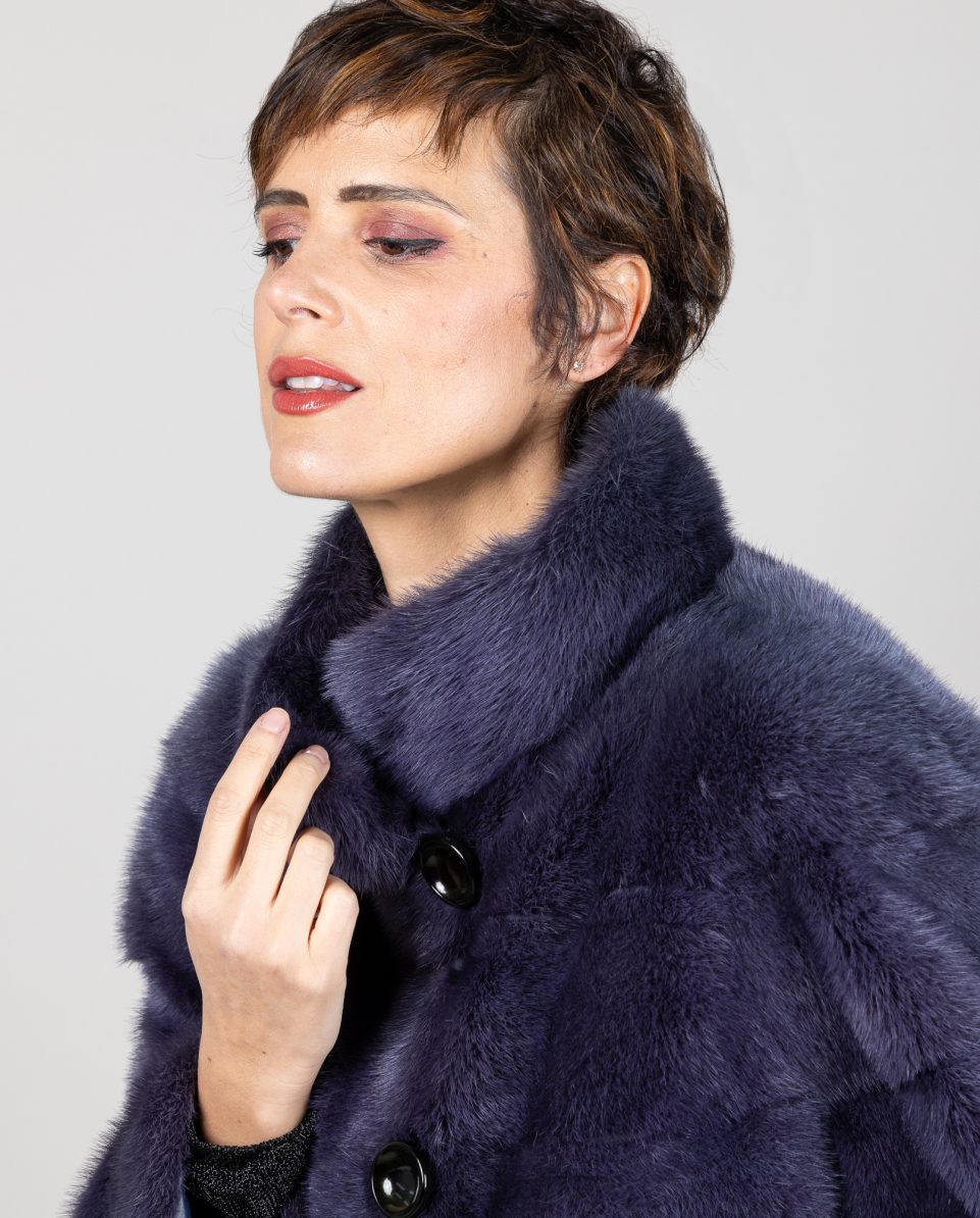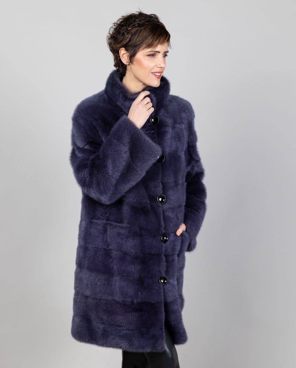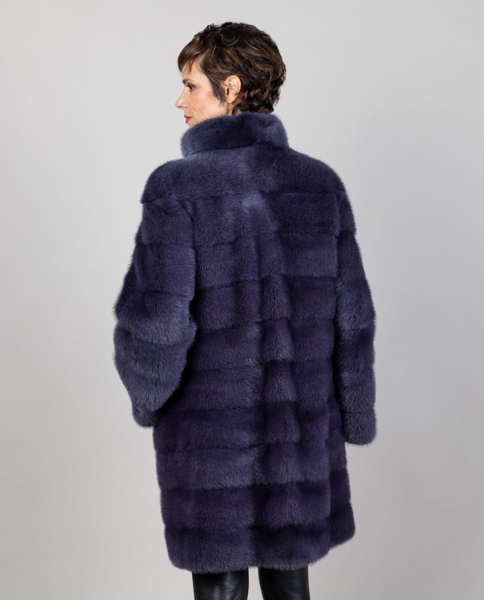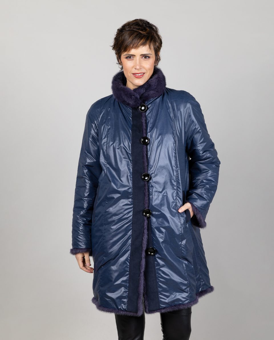 Abrigo de mujer de pelo de visón reversible gabardina en color azul cielo trabajado en horizontal. Cuello levantado. Bolsillos horizontales que cierran con imanes y cierre con botones por las dos caras ; marca De la Roca.