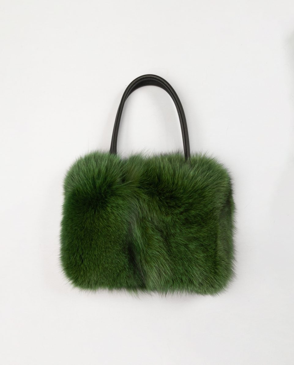 Bolso de multiposición de pelo de zorro trabajado en vertical en color verde. Asas redondas en cuero. Todos los productos son fabricados uno a uno artesanalmente en las instalaciones de España por profesionales del sector de la piel altamente cualificados. Todo ello fabricado con pieles 100% de origen español de muy alta calidad.