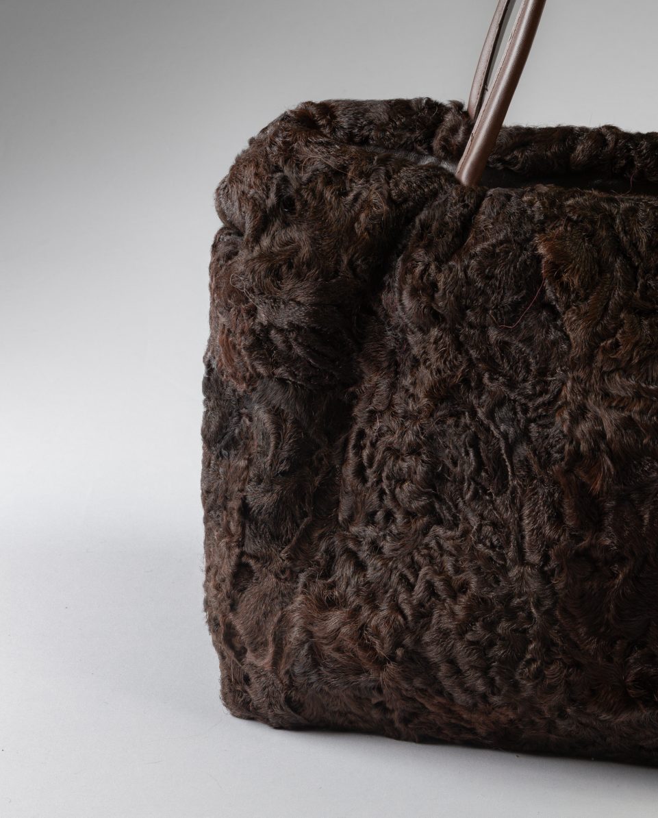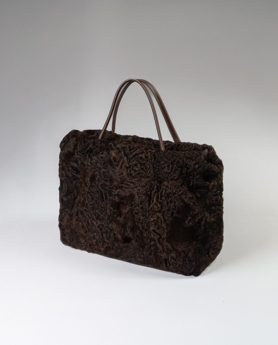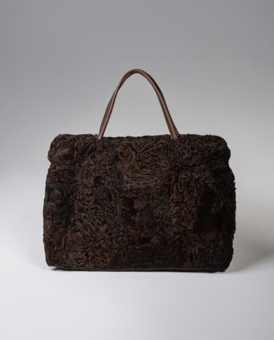 Bolso de multiposición de pelo de astracán en color marrón. Asas redondas en cuero. Cierre con cremallera. Todos los productos son fabricados uno a uno artesanalmente en las instalaciones de España por profesionales del sector de la piel altamente cualificados. Todo ello fabricado con pieles 100% de origen español de muy alta calidad.