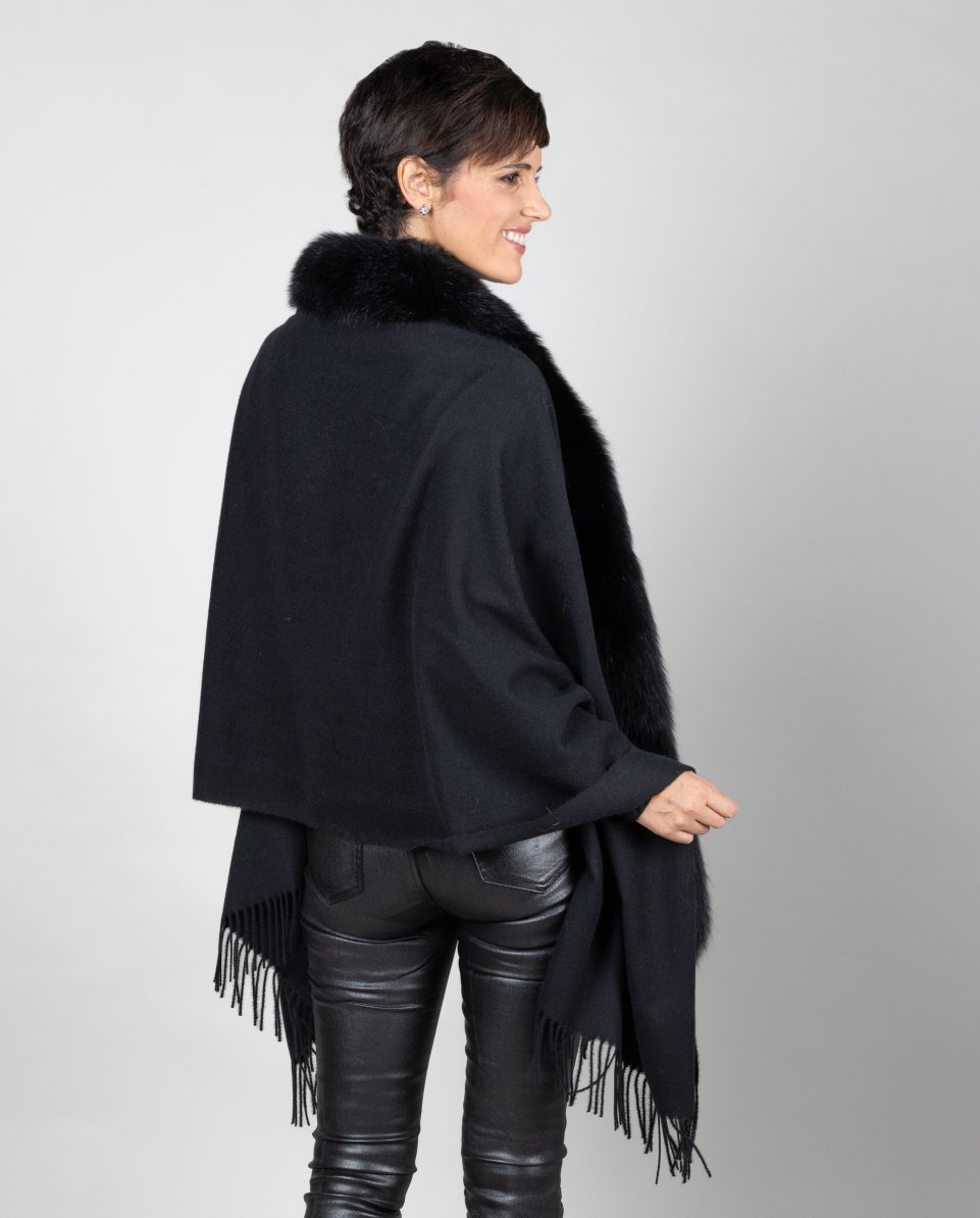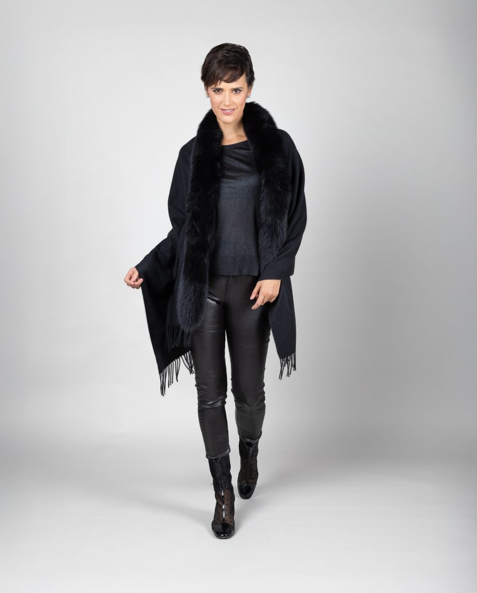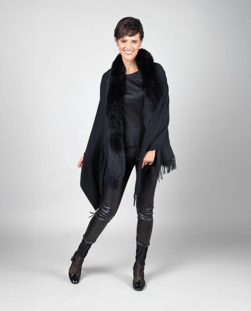 Capa de mujer De la Roca de lana shetland en color negro con ribete de zorro calidad Saga al tono. Confeccionado en España con pieles de alta calidad.; marca De la Roca.