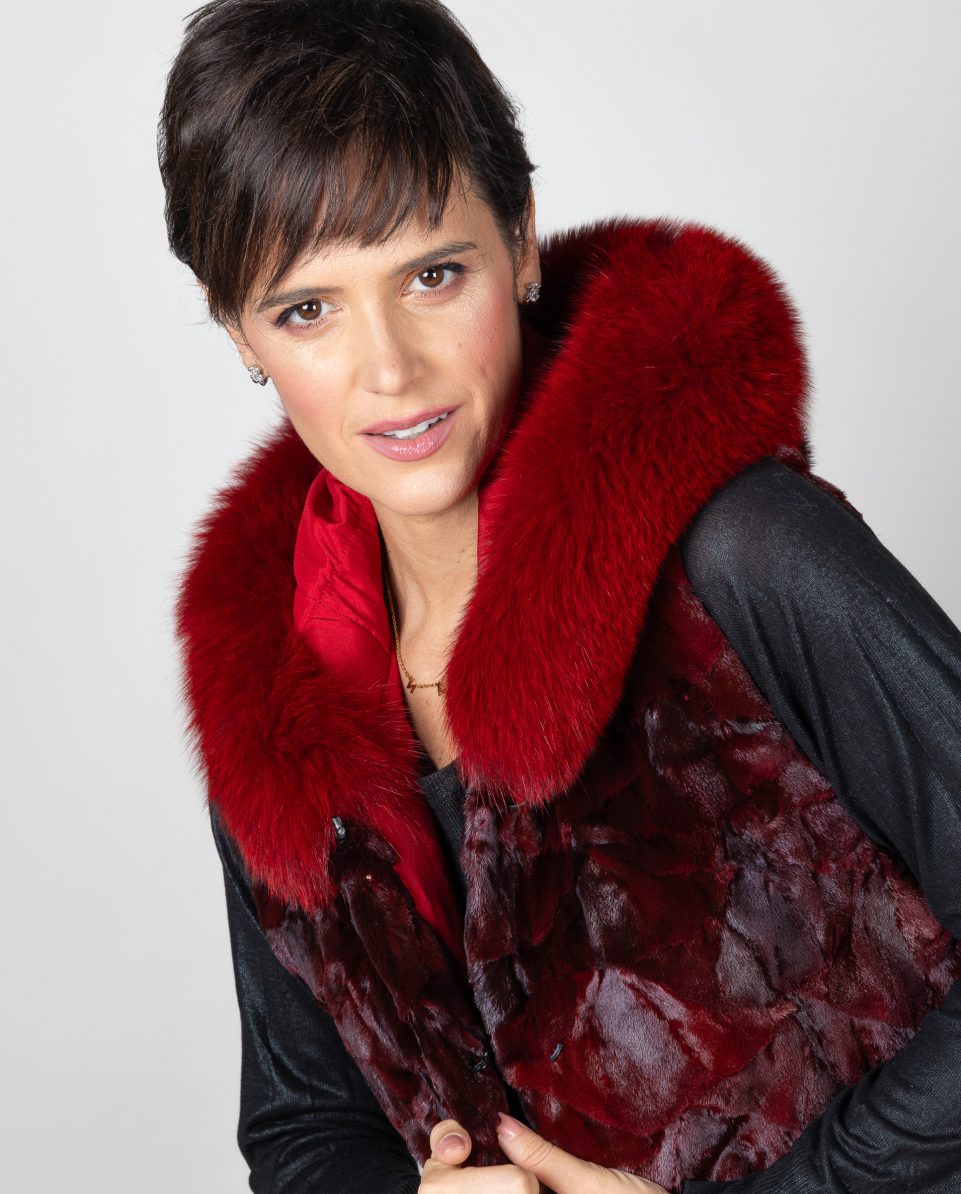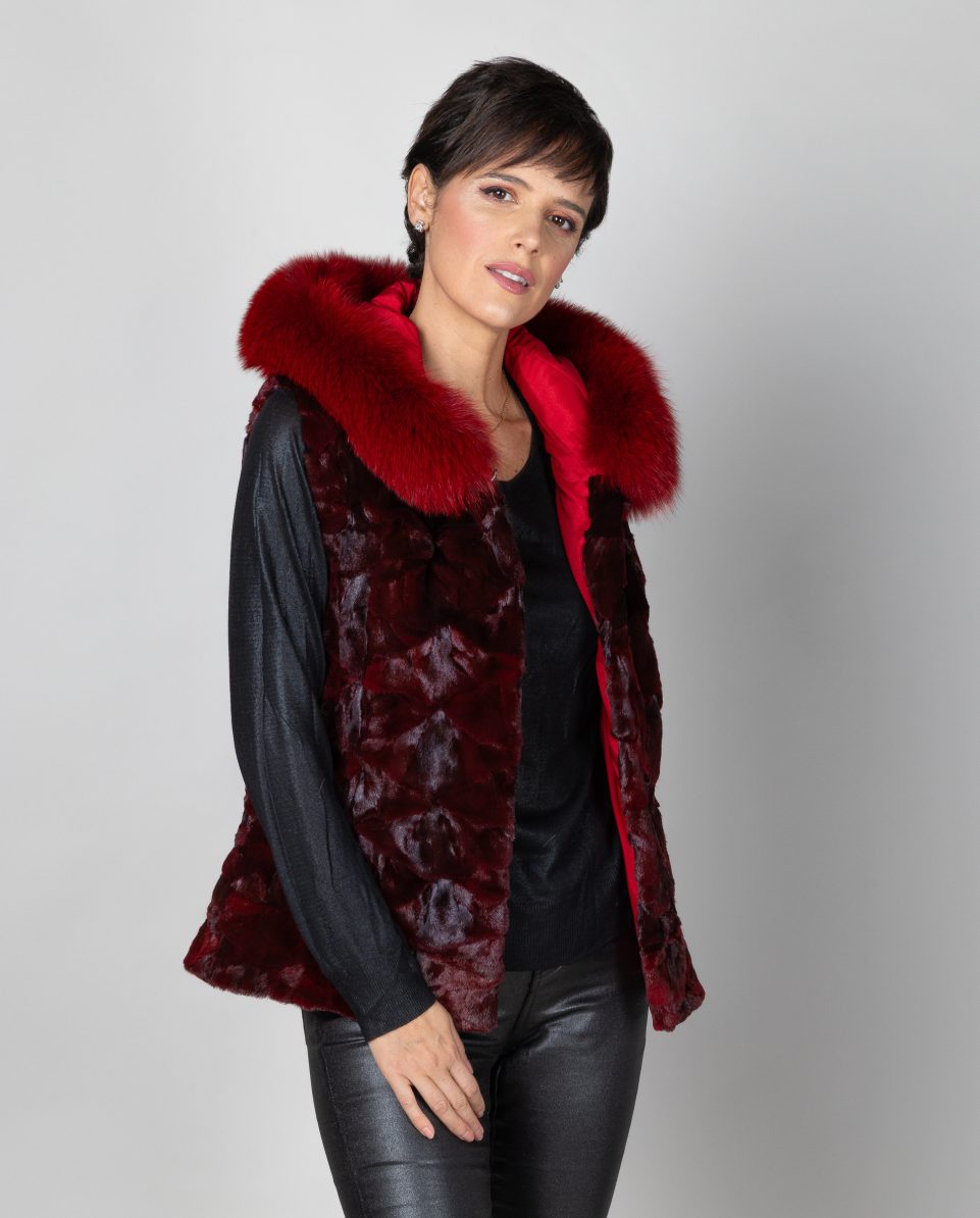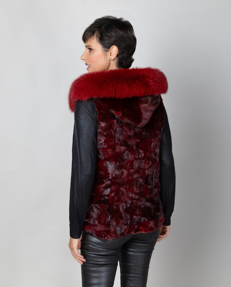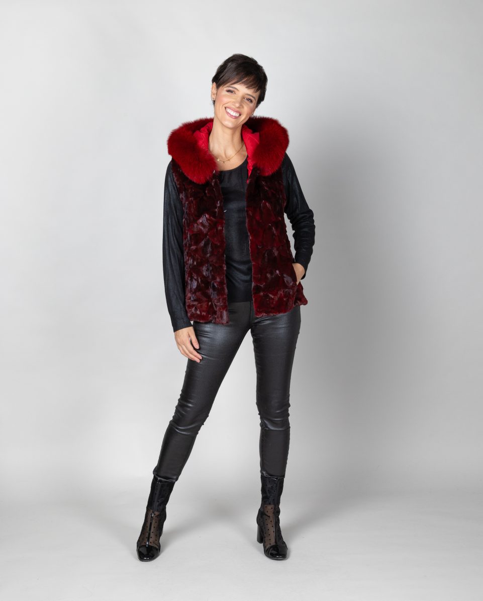Chaleco de mujer de pelo de nucas de visón con capucha en color burdeos y ribete de pelo de zorro al tono. Bolsillos verticales y cierre con clip peletero; marca De la Roca.