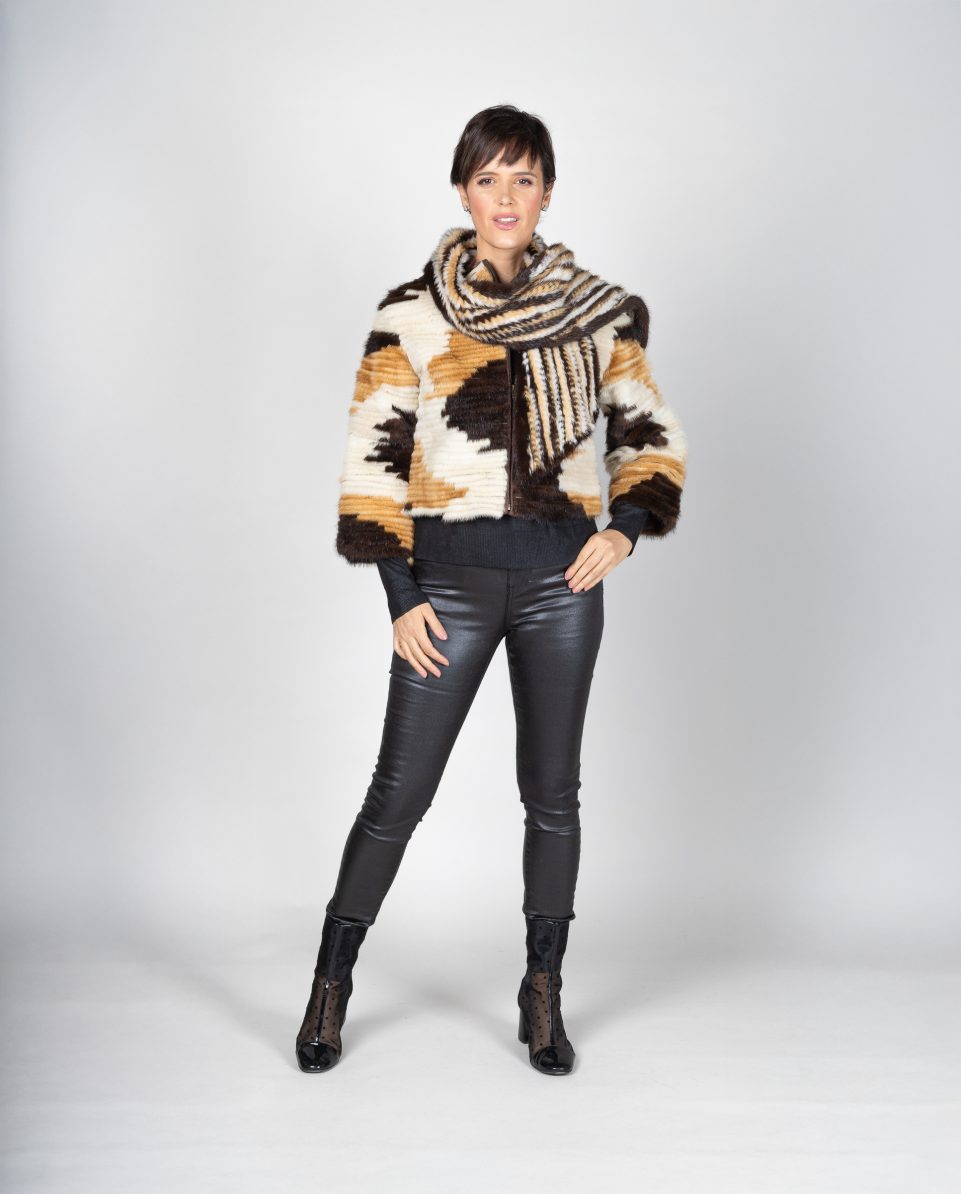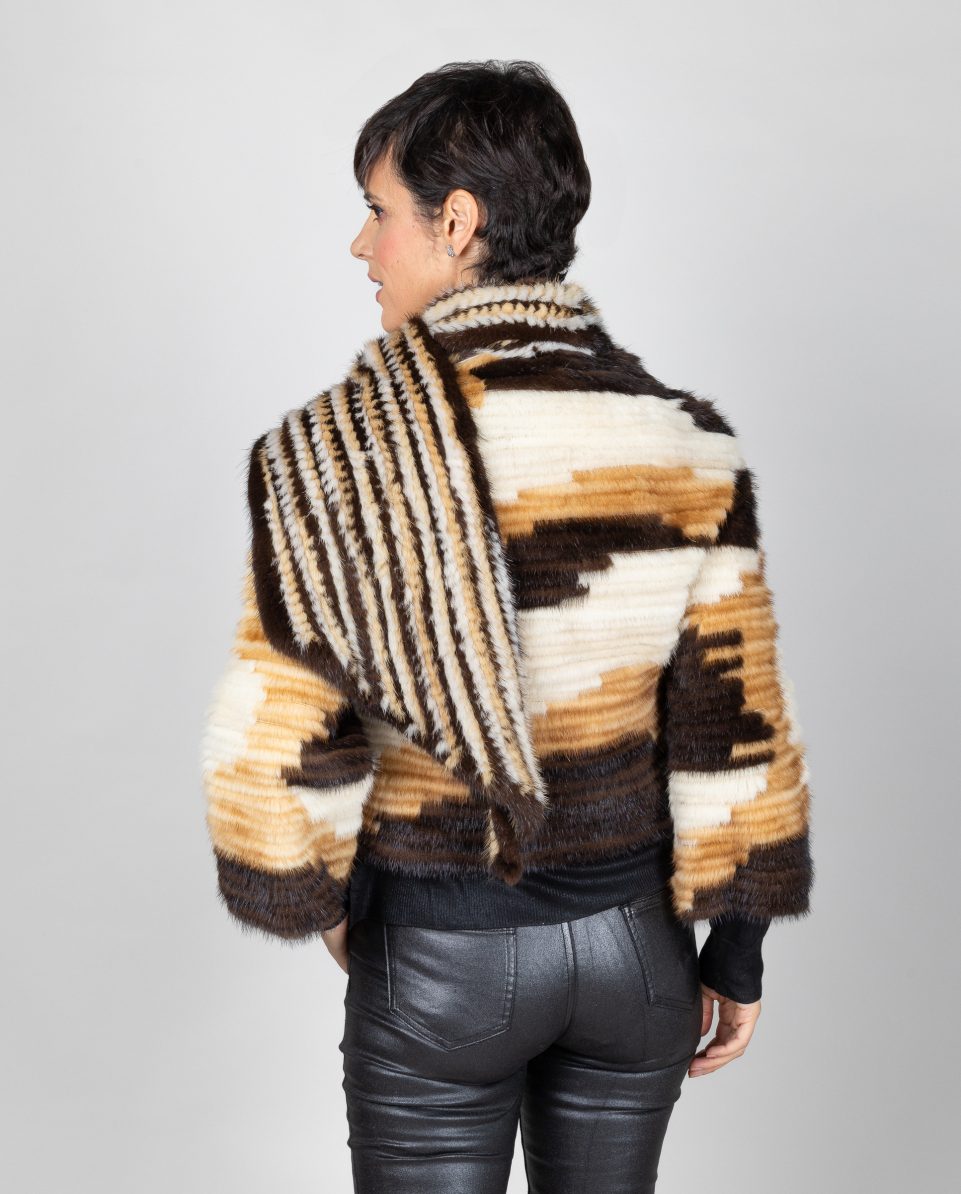 Chaqueta corta de mujer de pelo de visón linner horizontal multicolor con manga francesa. Cierre con cremallera y bufanda en el cuello; marca De la Roca.