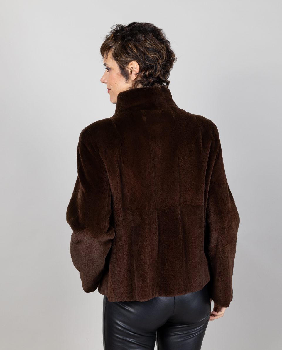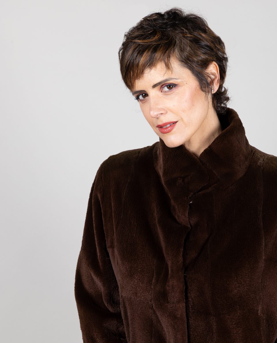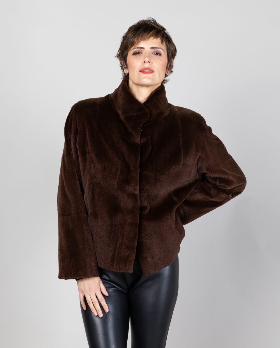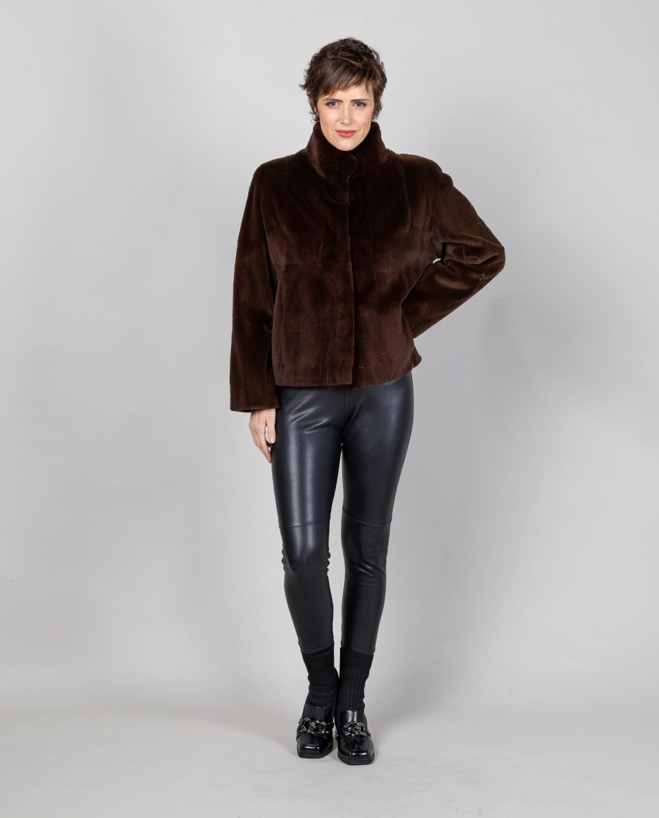 Chaqueta de mujer de pelo de visón rasado con cuello levantado en color marrón. Bolsillos verticales y cierre con clip peletero; marca De la Roca.