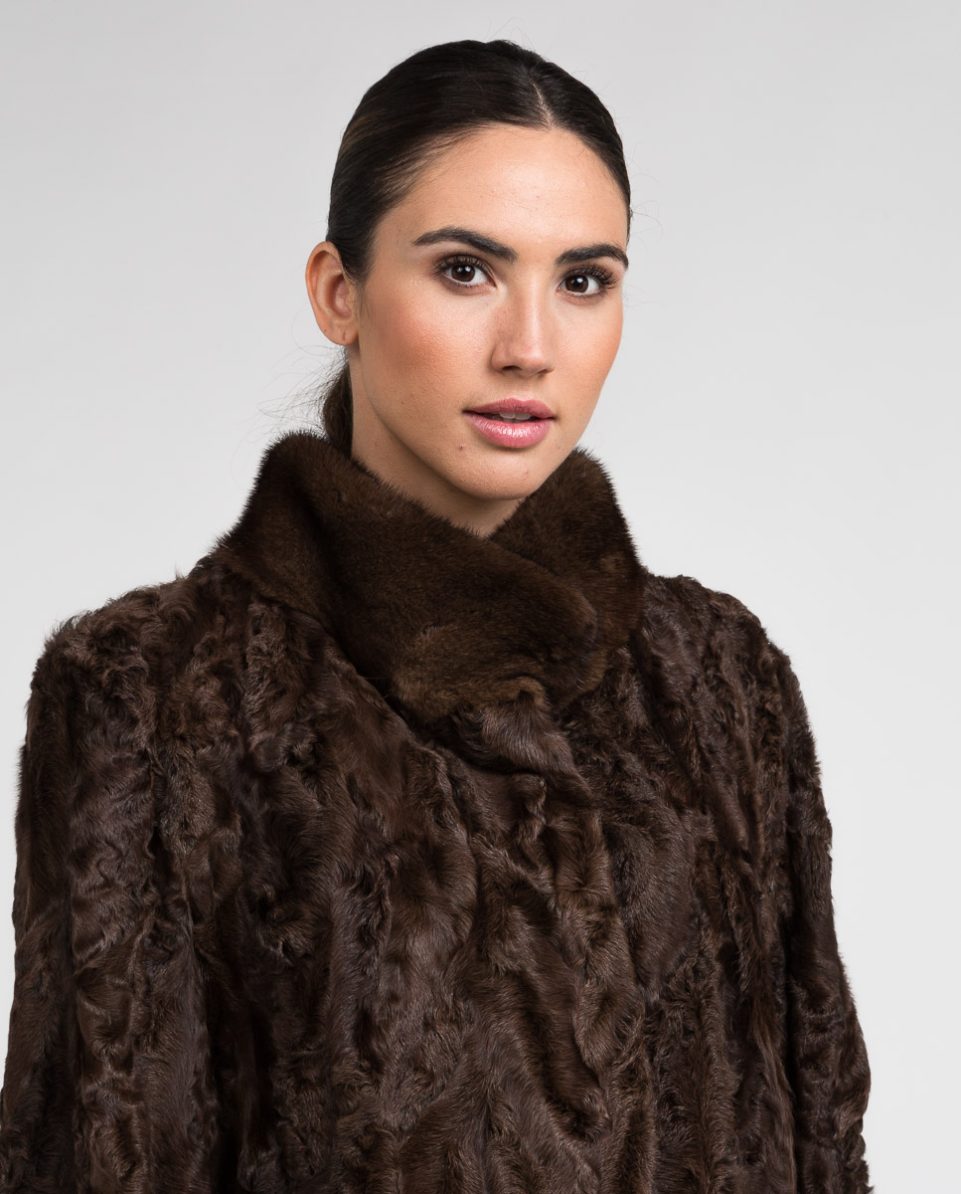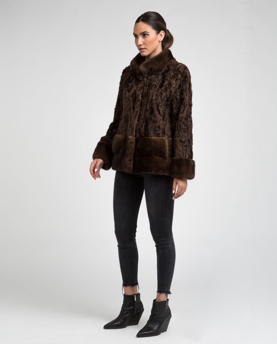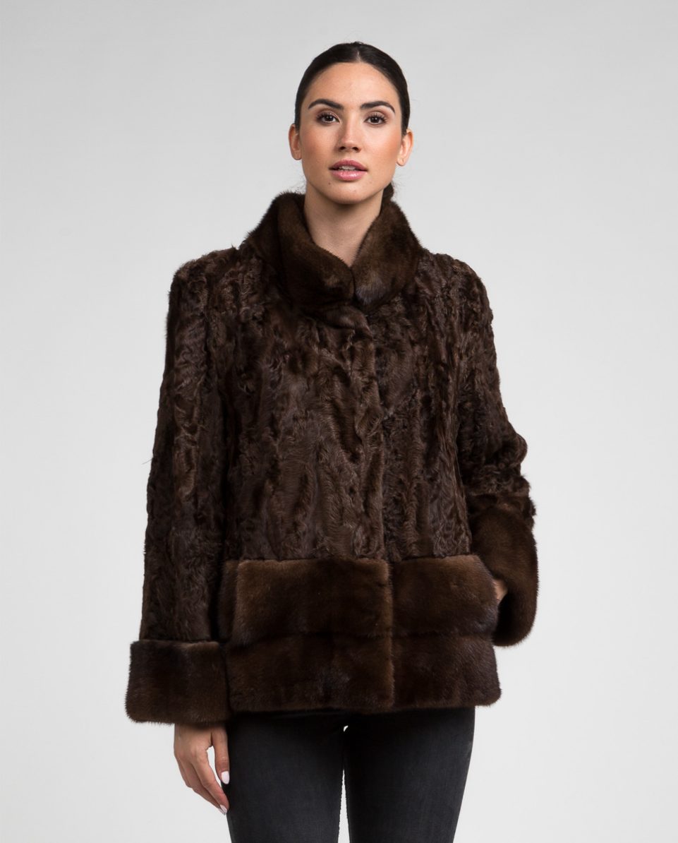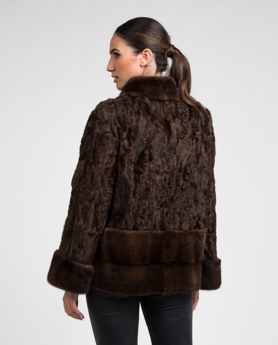 Chaqueta de pelo de mujer de tianjín y visón con cuello levantado en color marrón y 2 franjas horizontales de visón en tono en la parte inferior de la prenda y bocamangas de visón. Cuello levantado. Cierre clip peletero.; Marca De La Roca.