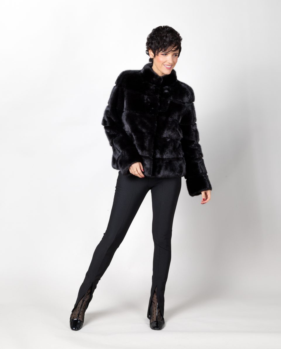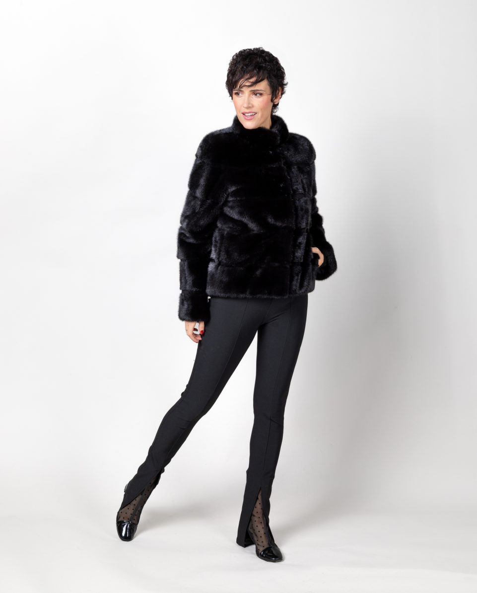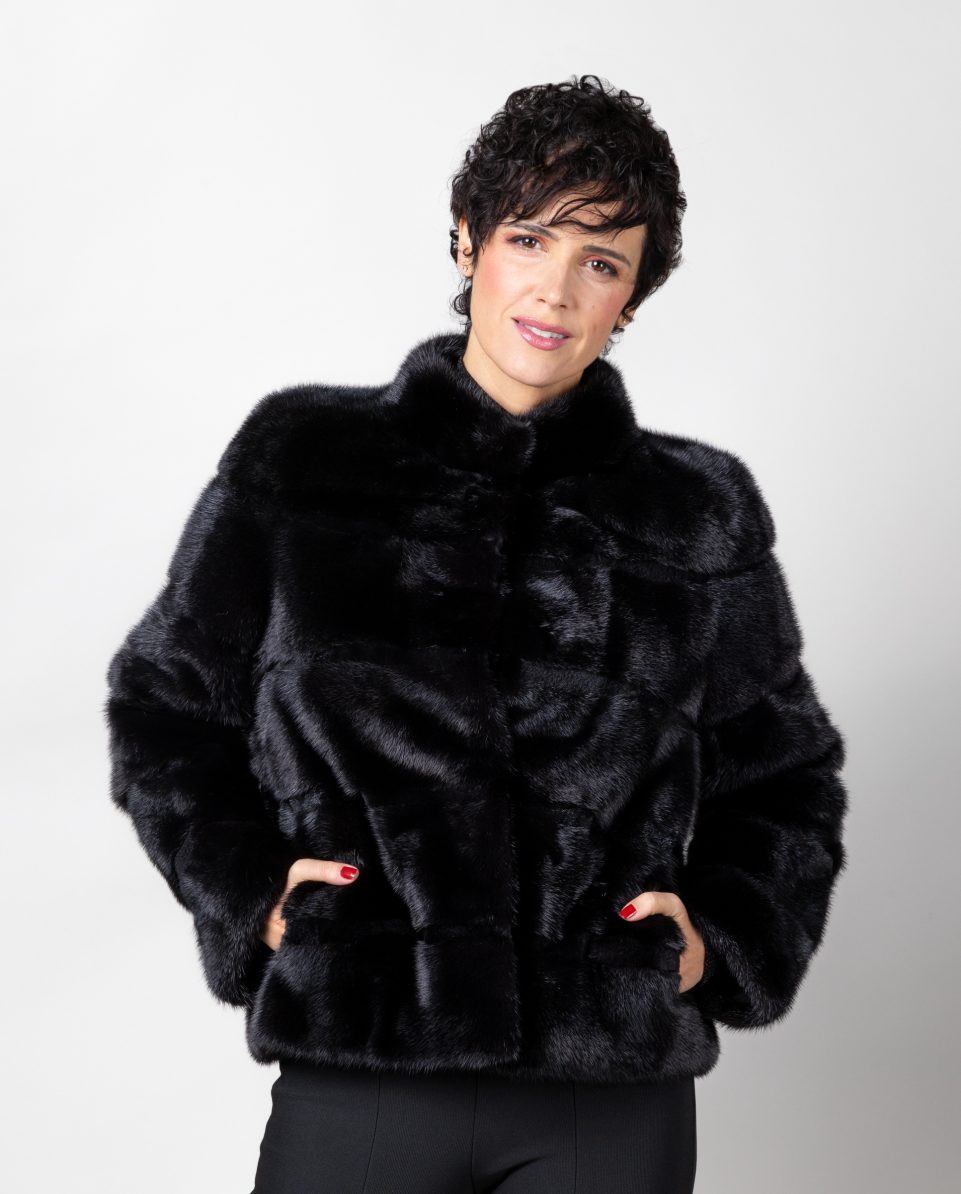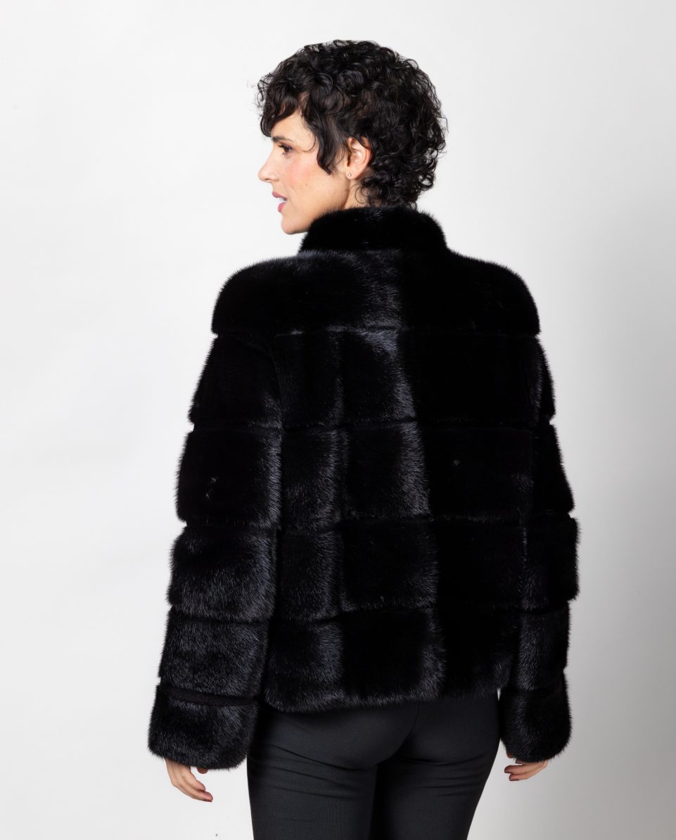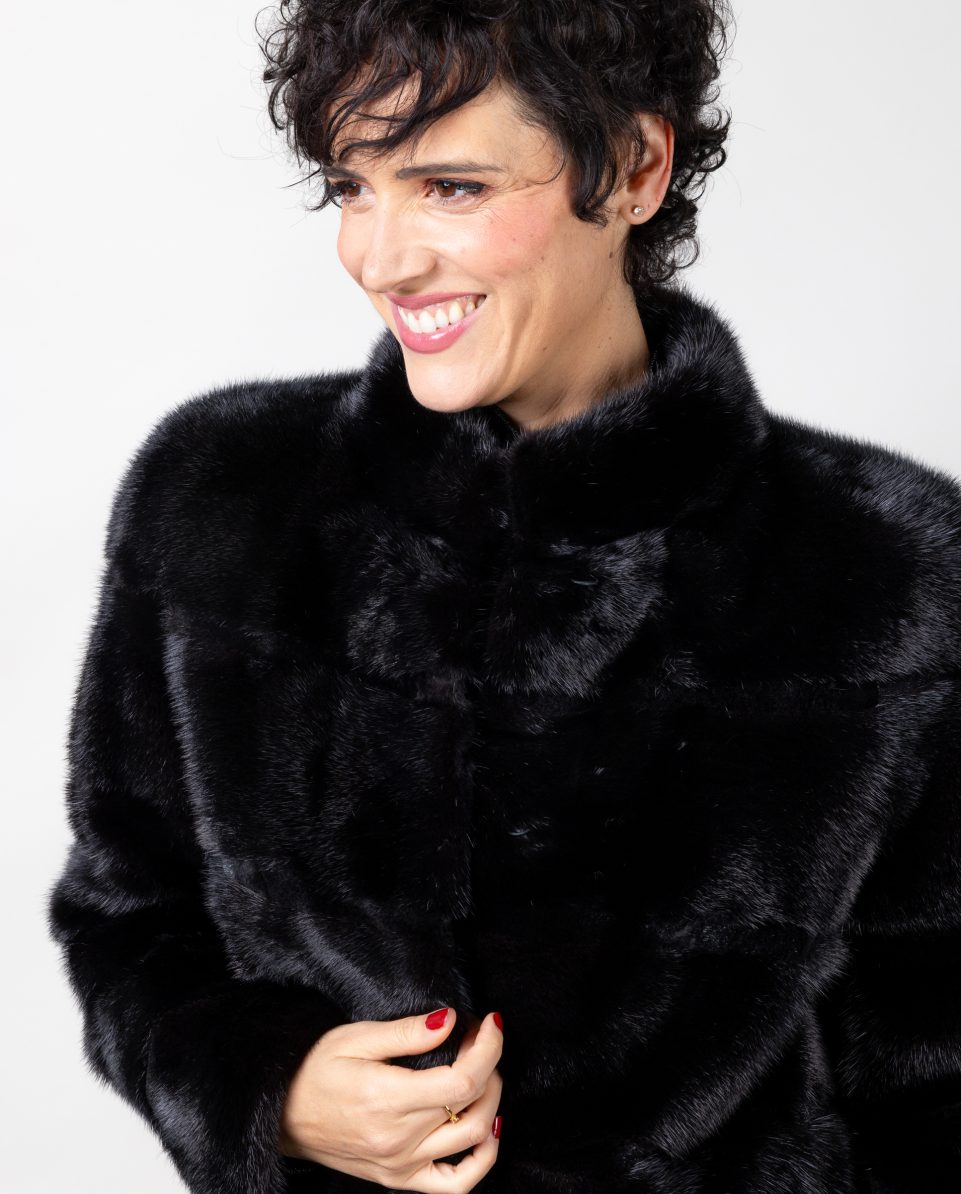 Chaqueta de visón diamante negro con inserciones al tono de visón rasado. Cuello levantado y bolsillos verticales. Cierre con clip peletero; marca De la Roca.