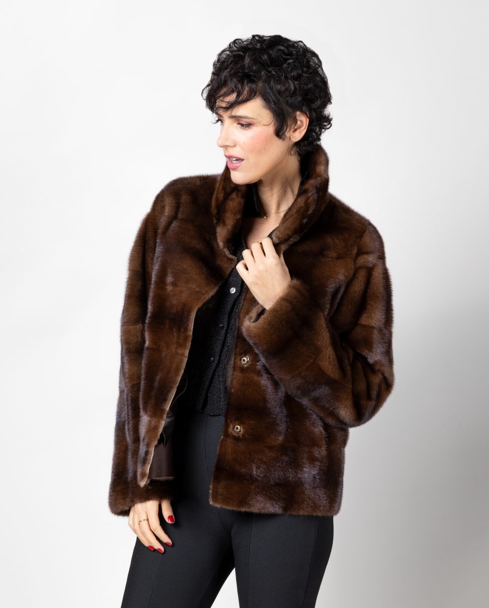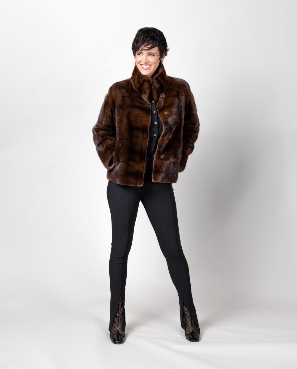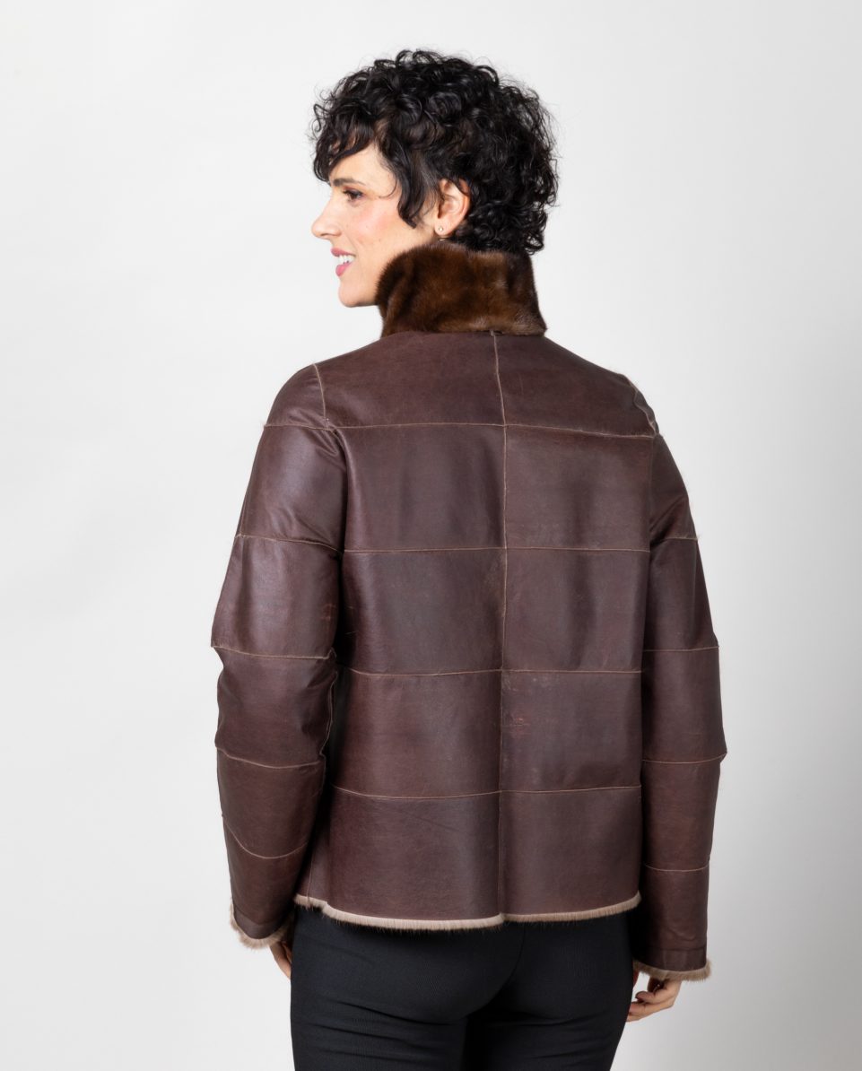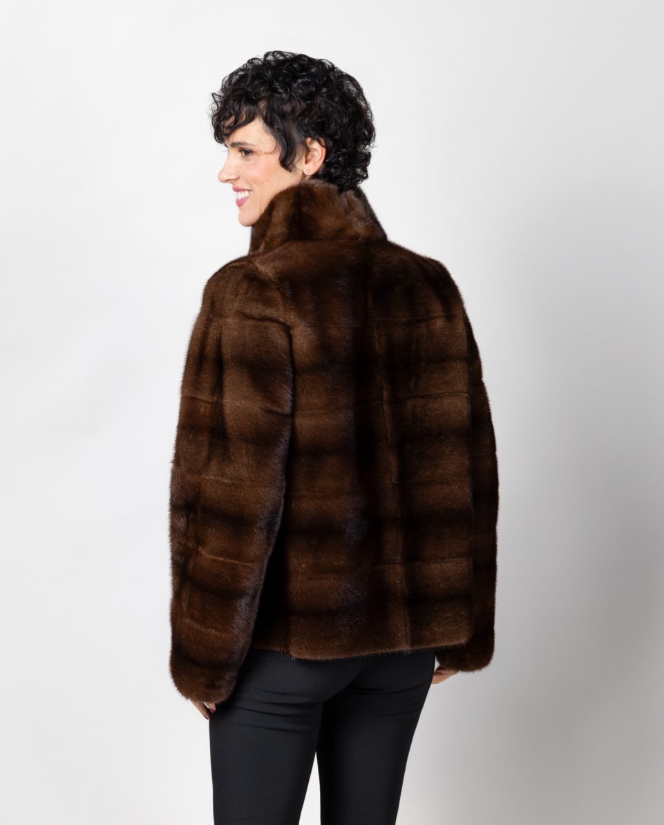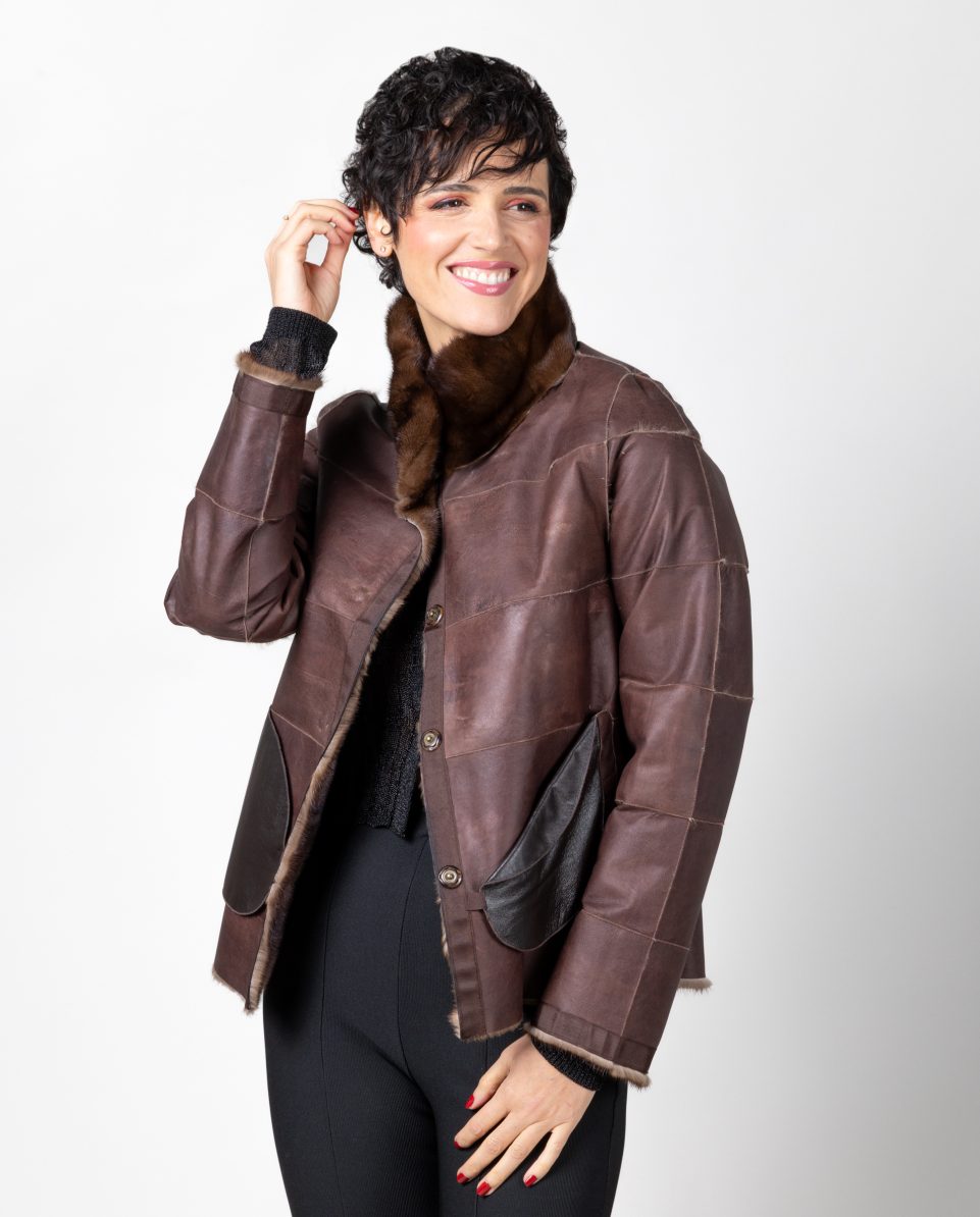 Chaqueta de visón napado reversible en color marrón trabajado en horizontal y cuello levantado y bolsillos verticales. Cierre con automáticos; marca De la Roca.