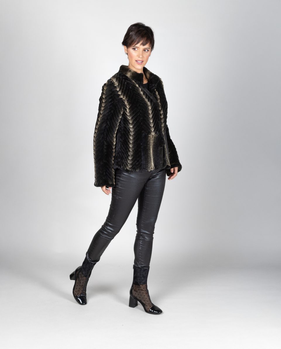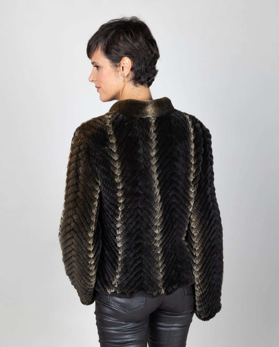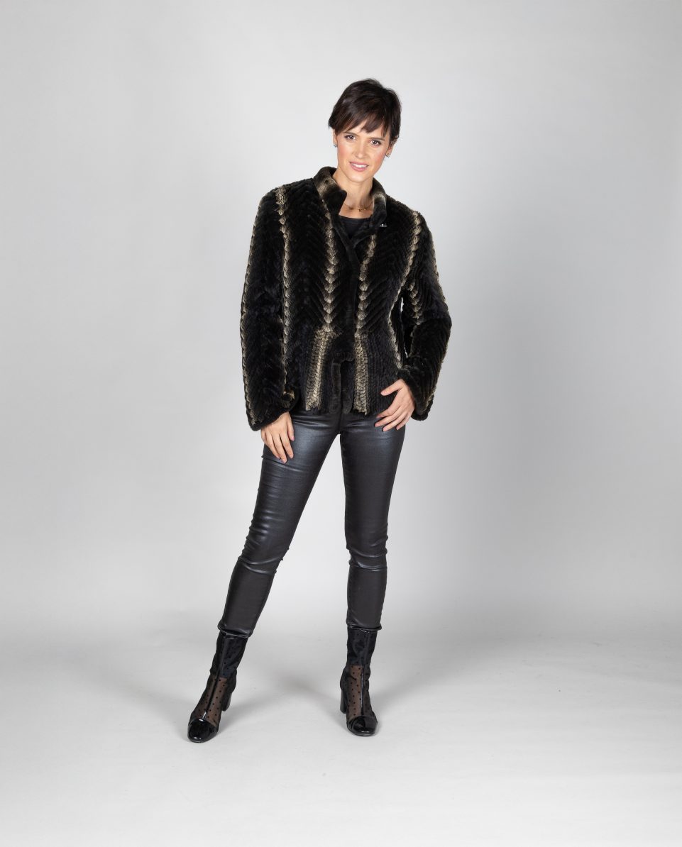 Chaqueta larga de mujer de pelo de rex rasado y tricotado en color chinchilla y marrón oscuro. Cuello levantado. Cierre con botón en cuello y ganchos forrados; marca De la Roca.