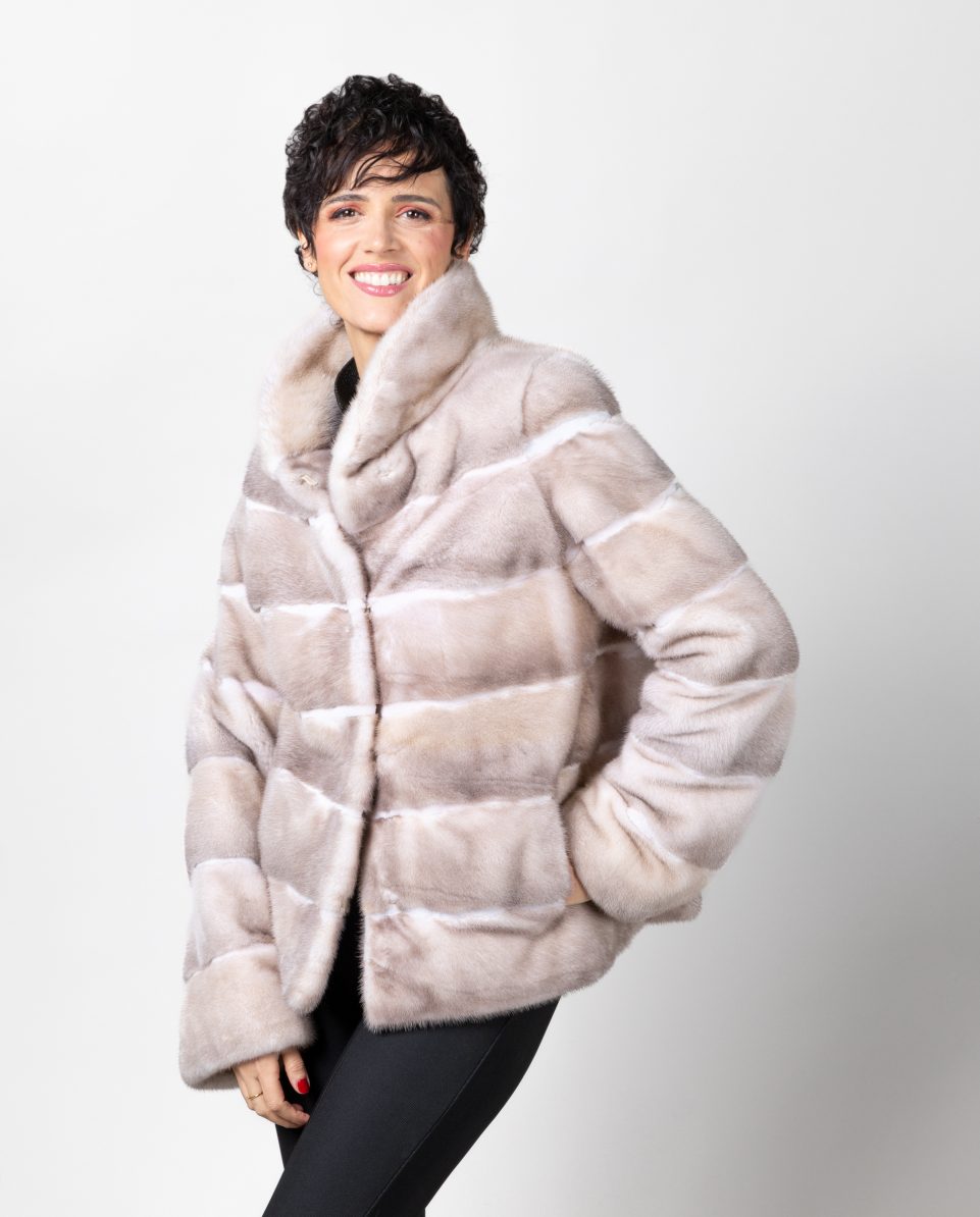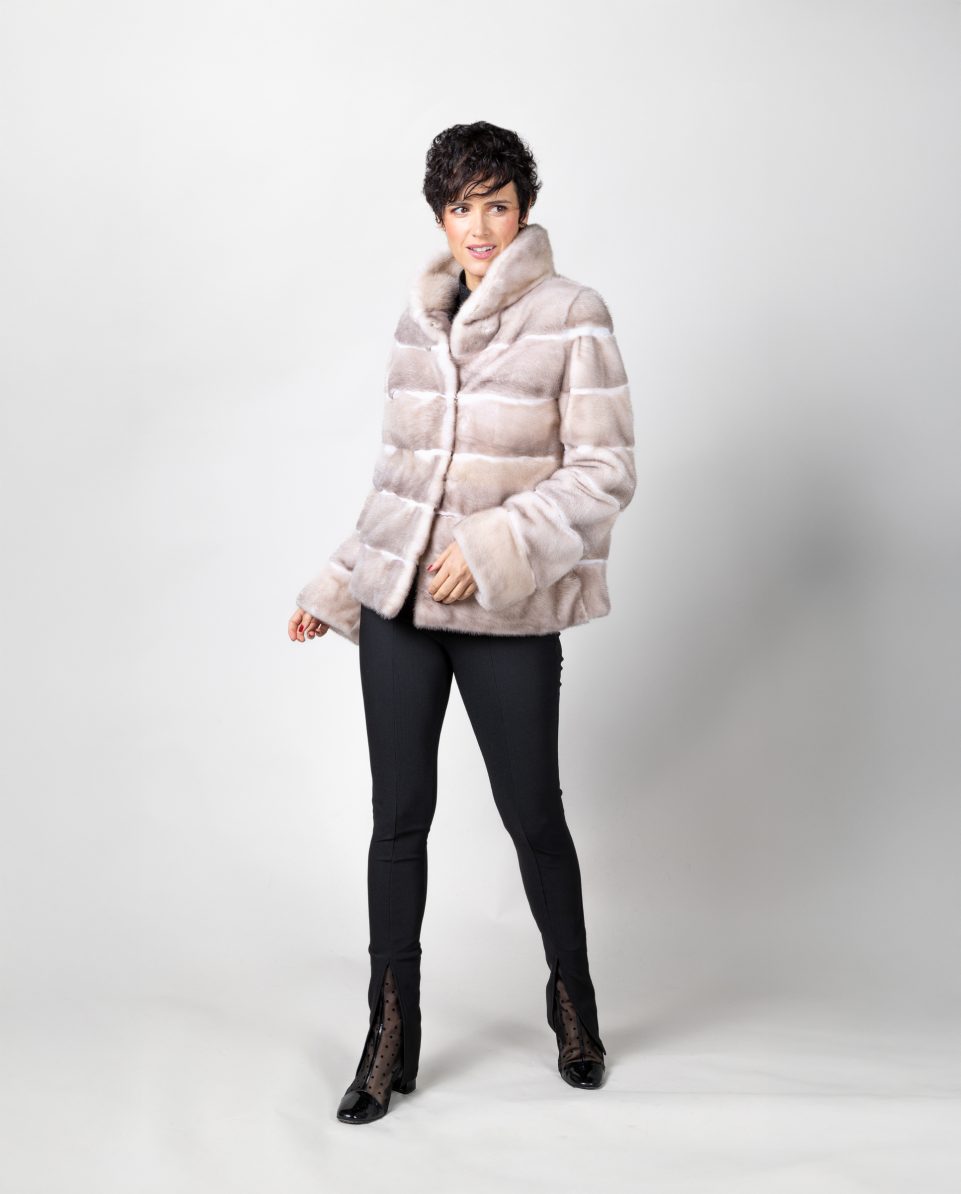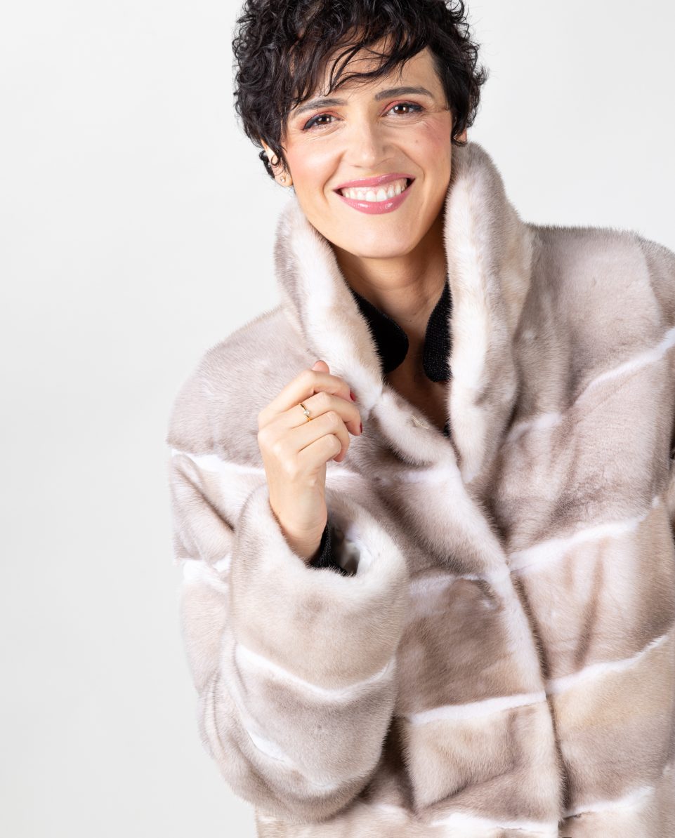 Chaqueta larga de visón con inserciones de visón rasado en color palomino. Cuello levantado y bolsillos verticales. Cierre con clip peletero; marca De la Roca.