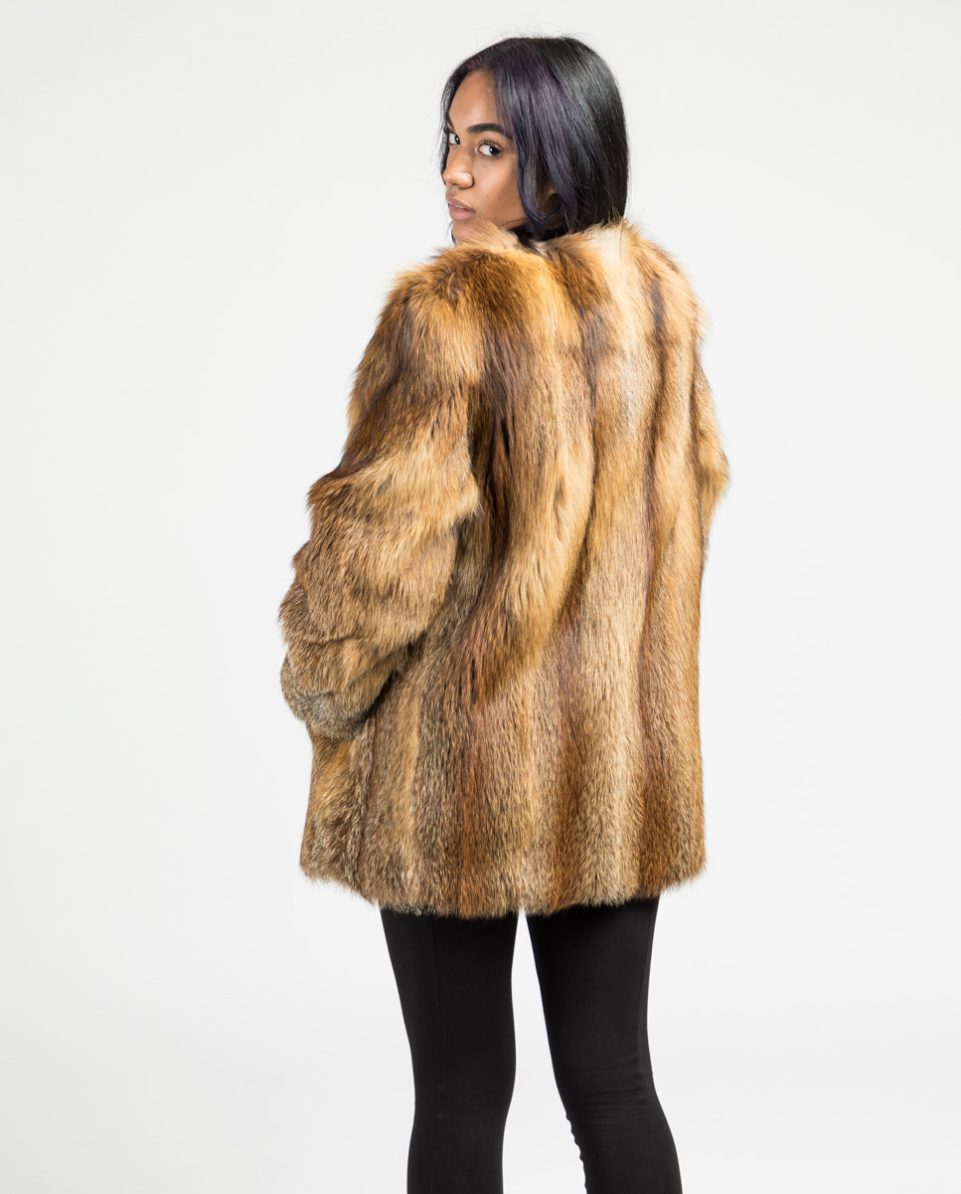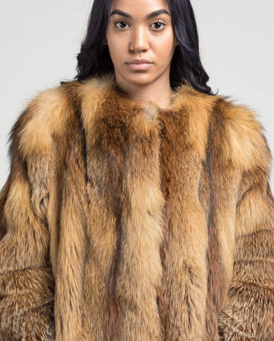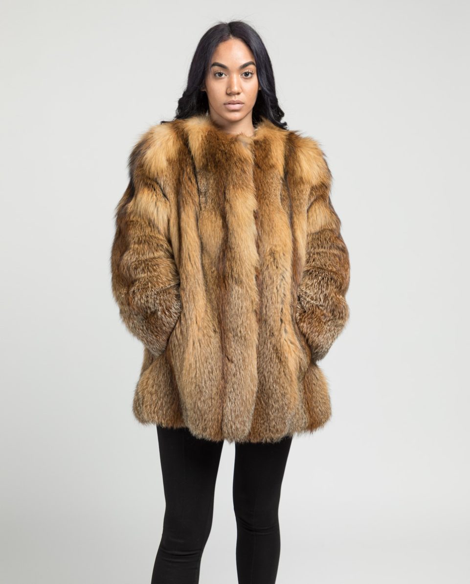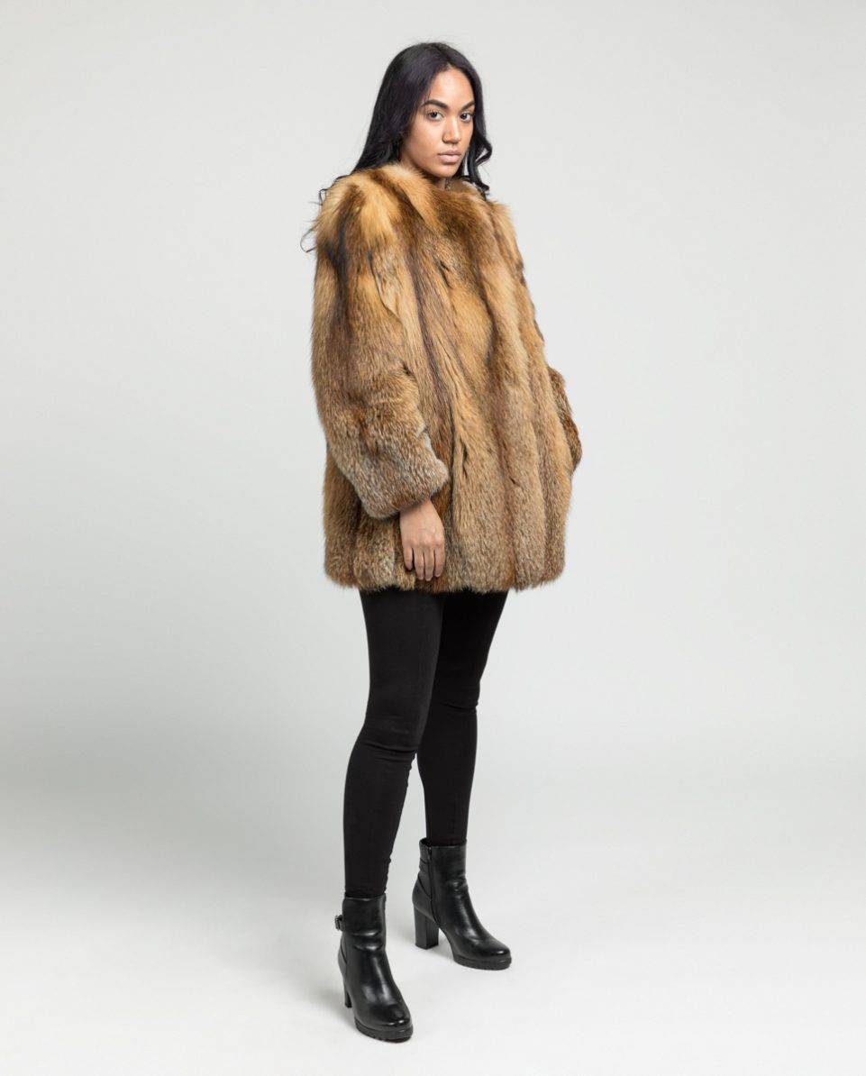 Chaqueta de mujer De la Roca de zorro virginia en color natural con cuello a la caja y bolsillos verticales. Estilo vertical.