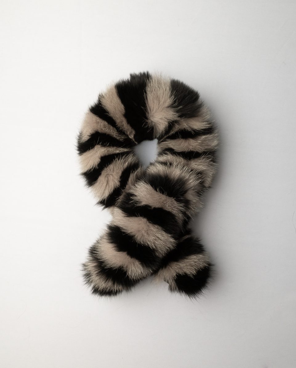 Cuello redondo de pelo de zorro bicolor a rayas en color gris y negro con cintas. Confeccionado en España con pieles de calidad Saga.